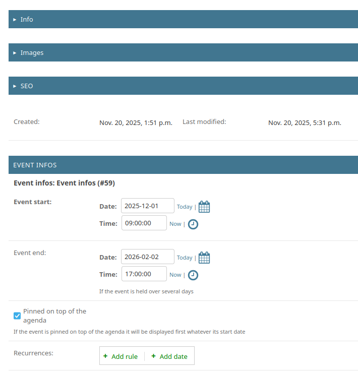 From this observation comes djangocms-stories-agenda, an extension to the existing blog infrastructure into a fully functional event system.